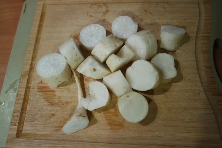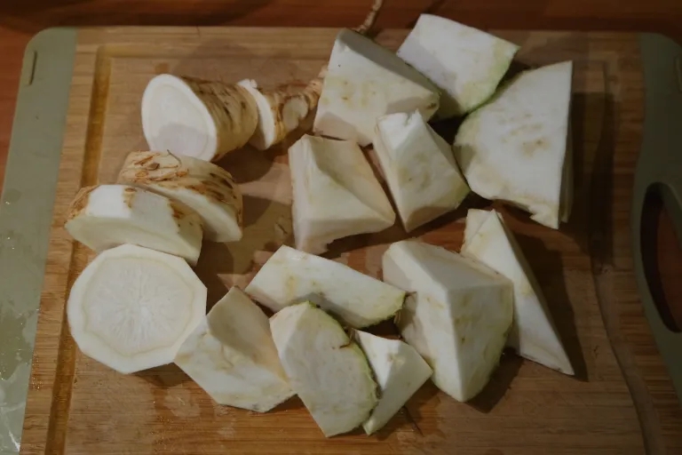 Aš recepto fotografavimo dieną turėjau ir petražolės šaknį ir salierą, tad įdėjau abu. Supjaustom gana stambiais gabalais.