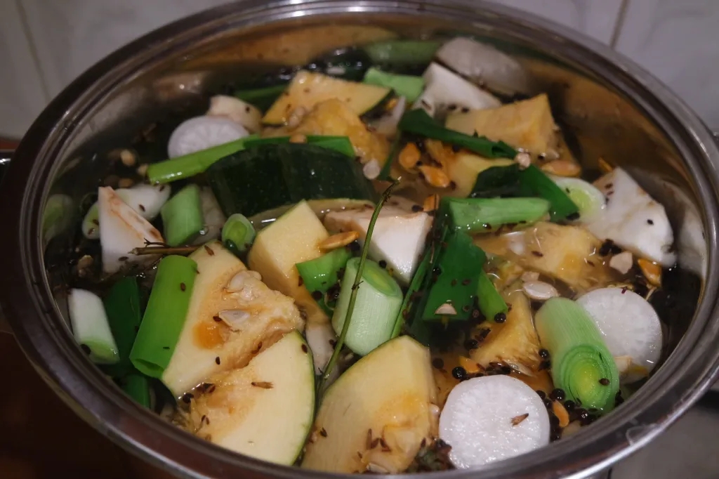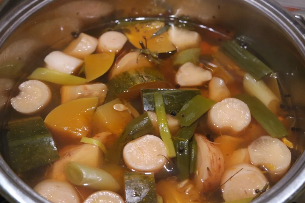 Imam 10l puodą ir pripilam į jį 5l vandens. Užvirinam vandenį. Vandeniui užvirus sudedam ingridientus. Daržoves pjaustom stambiais gabalais, neluptas, su visom sėklom. Tik prieš tai gerai nuplaukite su šepetėliu.