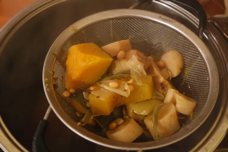 Tuomet su samčiu išsemiu į sietelį ir patogų paimti puodą su rankena daržoves. Daržovės išmetamos, vartojamas tik skystis.
